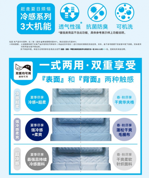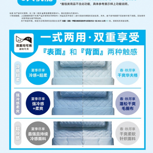 同时,宜得利接触冷感系列的部分产品还贴心使用了两种面料,一面是Q弹柔滑的冷感材质,满足喜欢清凉体感的消费者,而另一面则采用干爽舒适的华夫格材质,触感软滑细腻,湿热天气里接触身体时也都干干爽爽。