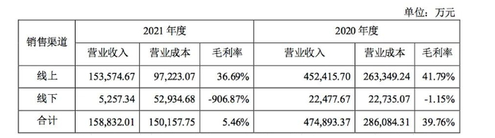 最终,在亏本“泣血甩货”之际,线下清货的毛利率低至-907%,继而连累线上,使全年综合毛利降为个位数的5.46%。