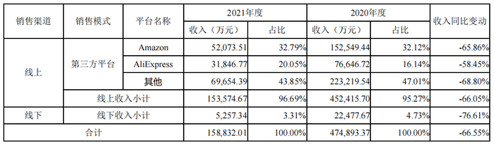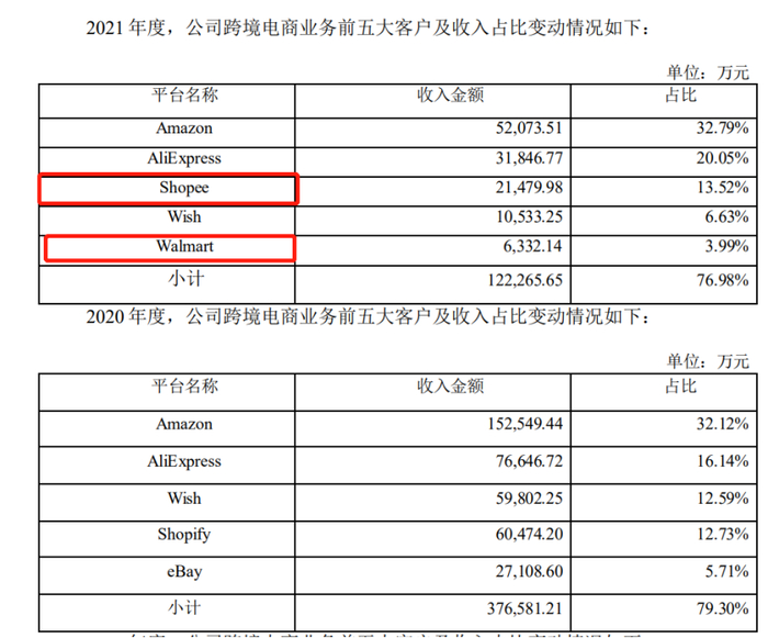 2020年度,有棵树收入占比前五的平台分别为亚马逊、速卖通、Wish、Shopify和eBay,到了2021年变为亚马逊、速卖通、Wish、Shopee和沃尔玛。