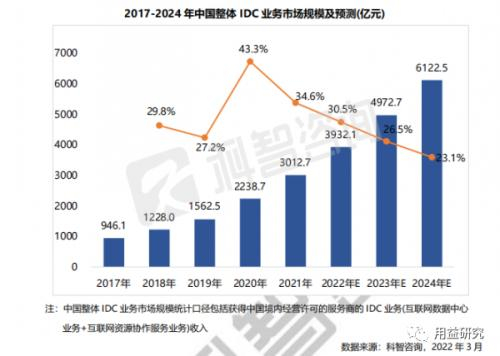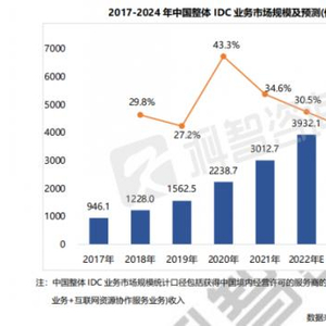 伴随着互联网的快速发展、大数据时代的来临、5G&;物联网技术的进步等行业与技术的革新,数据量激增且逐步成为新时代的重要的资产。这推动具备集中数据存储、数据计算等功能的数据中心的新基建行业的快速发展。根据科智咨询最新的研究报告显示,短短4年时间(即:2018年-2021年),中国整体IDC业务规模从不到1000亿(2017年末数据),增加到2021年的3012.7亿,累计增长了2倍多,近四年复合增长率约34%,中国IDC行业保持一个较快的增长速度。伴随着国家政策的大力扶持以及数据指数级流量增长,各类机构(电信运营商、数据中心企业、配套设备产商、金融资本等)也会继续加大对IDC产业的投入。根据科智咨询预测报告,2024年中国IDC行业将达到6000亿的市场规模(即:未来3年时间,IDC业务规模将翻1倍),市场潜力较大。