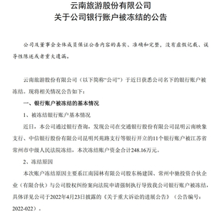 股权纠纷致公司银行账户被冻结 云南旅游收关注函