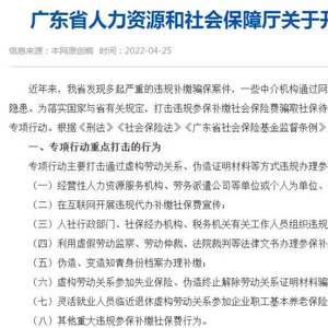 广东省人社厅决定于2022年4月至12月在全省范围内开展打击违规参保补缴问题专项行动。专项行动主要打击通过虚构劳动关系、伪造证明材料等方式违规办理参保和补缴社会保险费问题。