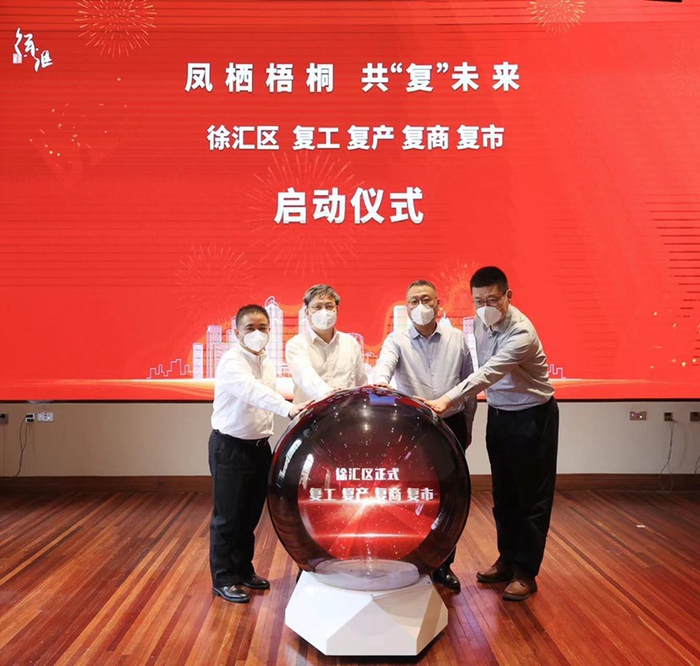为此,会上举行了徐汇区复工复产复商复市启动仪式。肖贵玉、曹立强、钟晓咏、沈权共同为徐汇区全面复工复产复商复市按下启动键。在筑牢“防疫网”的同时,徐汇区将全力以“复”,加速复工复产、复商复市“快进键”。