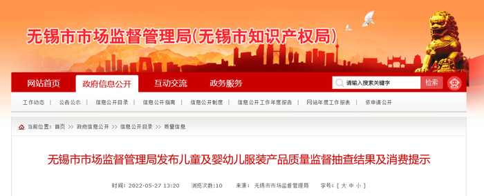 中国质量新闻网讯 据江苏省无锡市市场监督管理局网站2022年5月27日消息,2022年度,无锡市市场监督管理局对儿童及婴幼儿服装产品质量进行了监督抽查。共抽查产品30批次,不合格产品2批次,不合格发现率6.67%。