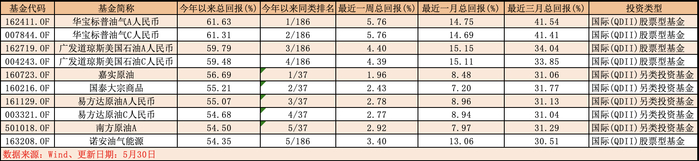 单看今年以来的数据,回报率最高的前十只基金为华宝标普油气A人民币、华宝标普油气C人民币、广发道琼斯美国石油A人民币、广发道琼斯美国石油C人民币、嘉实原油、国泰大宗商品、易方达原油A人民币、易方达原油C人民币、南方原油A和诺安油气能源,回报率在54.35%至61.63%之间。