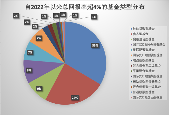 虽然近段时间基金表现不佳,但时代财经据Wind数据统计,也有148只基金2022年以来的回报率跑赢了下调前的长期存款利率(取4%为年化利率基准)。其中,33%为被动指数型基金,24%为商品型基金,涉及的投资板块包括石油、原油、豆粕期货、煤炭、黄金等。