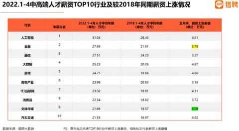 5月30日,猎聘大数据研究院发布《2022未来人才就业趋势报告》,报告显示,人工智能、生产制造、大数据、能源环保等行业招聘需求持续爆发。其中,人工智能人才平均年薪最高,达到31.04万,而金融人才薪资上涨最快。