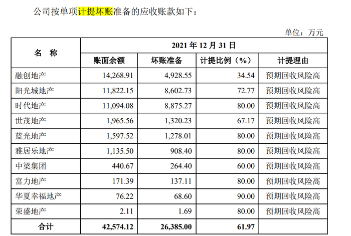 2021年,马可波罗对荣盛地产、华夏幸福地产、阳光城地产、融创地产10家地产客户共计计提坏账准备的应收账款合计2.64亿元,计提比例为61.97%。