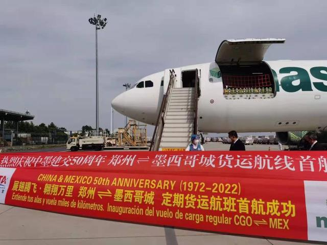2022年恰逢中国与墨西哥建交50周年,5月28日,中国河南郑州—墨西哥首都墨西哥城之间直飞货运航班的首航仪式在郑州新郑国际机场举行,墨西哥驻华大使施雅德先生(Dr. Jesús Seade)与河南省、郑州市政府及郑州机场集团领导出席首航仪式。此次首航由墨西哥货运航空公司马斯航空一架全货机执飞。