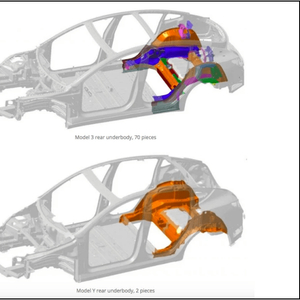 只不过,特斯拉在这项技术上做了一些创新,而且很大胆。Model Y的车架后底板,包括后车身底板、后轮拱、后横纵梁在内,用一体式压铸技术,直接做成了一个铸铝件,由原来的70多个零件,变成了一个超大零件。