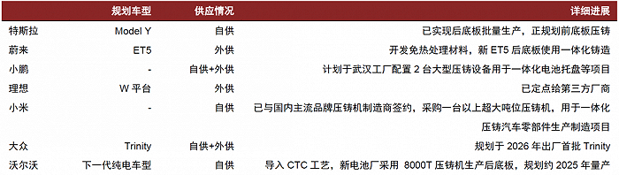 跟进这项工艺的车企中,特斯拉是采取完全自供的方式,蔚来、理想、小米是外供,小鹏、大众是自供+外供相结合,沃尔沃将在下一代纯电车型上采用自供方式。未来还会有更多车企加入。