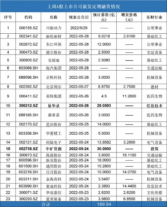 2022年5月23日至5月29日,中矿资源(002738.SZ)、易华录(300212.SZ)、新安股份 (600596.SH)、芭田股份(002170.SZ)等23家A股上市公司发布新的定增计划,预计融资额累计约为189.94亿元。