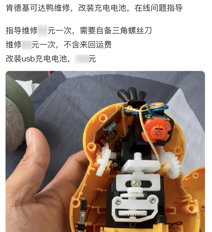 “我平时就喜欢研究玩具,反正家里什么工具都有,拆开一眼大概就能看懂结构,我发现玩具里有一个零件设计可能存在缺陷,导致鸭子不能摆手,去网上查发现很多人都有这个问题,就自己找配件修了。”