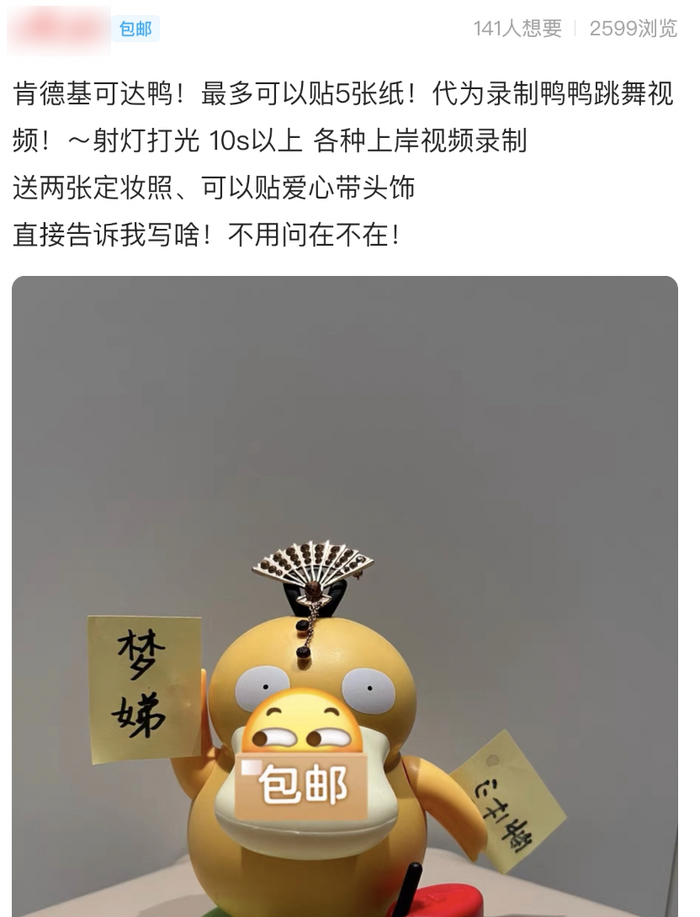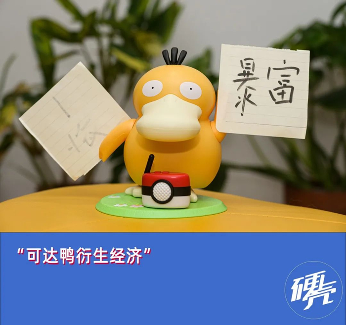 可达鸭爆火后,不少人盯上了它身上潜在的商业价值,一些敏锐的年轻人从中嗅到商机,发掘出了一连串“可达鸭衍生经济”。
