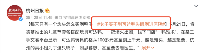 5月21日下午,躺在家里刷微博的95后“打工人”巨巨突然翻到了肯德基新出的可达鸭玩具,于是她踩着拖鞋冲下楼,去店里碰碰运气。