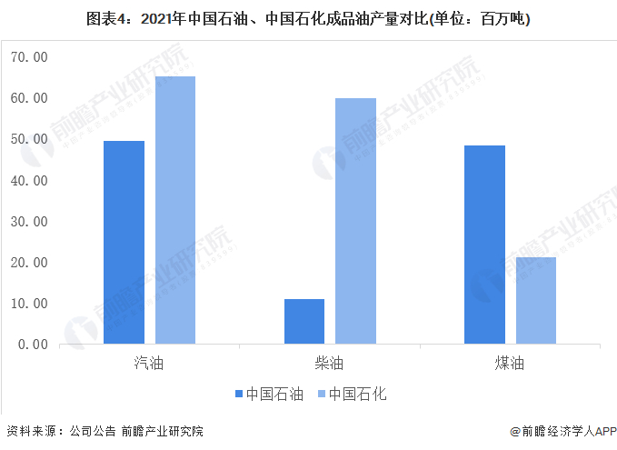 从成品油产量来看,2021年中国石化在汽油、柴油产量上大幅领先,而中国石油的煤油产量更高。