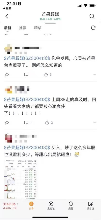 面对芒果超媒股价的回落,也有股民放言表示:“你会发现,心凌被芒果台耍了”“等甜心出局就砸盘。”