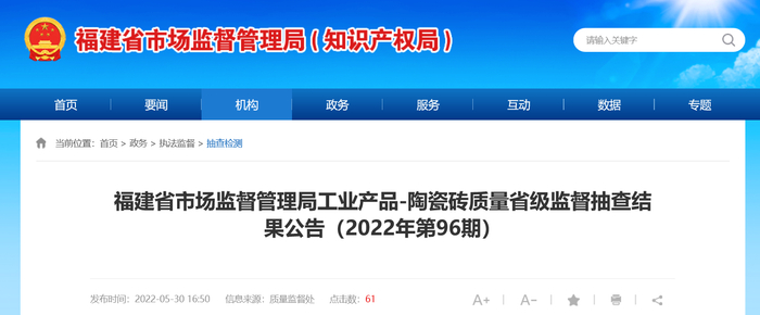 中国质量新闻网讯 2022年5月30日,福建省市场监督管理局网站发布《福建省市场监督管理局工业产品-陶瓷砖质量省级监督抽查结果公告(2022年第96期)》。