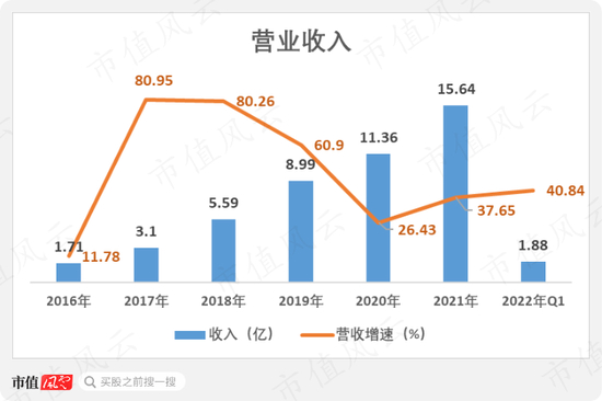 腾讯看上博思软件可能与其高速增长的财务表现有关。自2016年以来,公司的收入从1.71亿增长至15.64亿,复合增速达55.7%,2022年Q1同比增长40.8%。