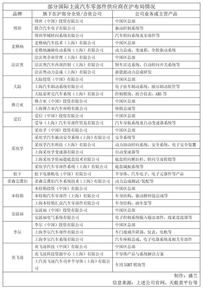 多家向上汽集团供货的国际头部零部件制造商旗下的全资子公司或合资公司也坐落在安亭。记者统计发现,在全球前十大汽车零部件公司中,采埃孚、博世、麦格纳、爱信、大陆集团、法雷奥和李尔公司等9家跨国公司将中国总部设在了上海,并在当地设立了生产基地。