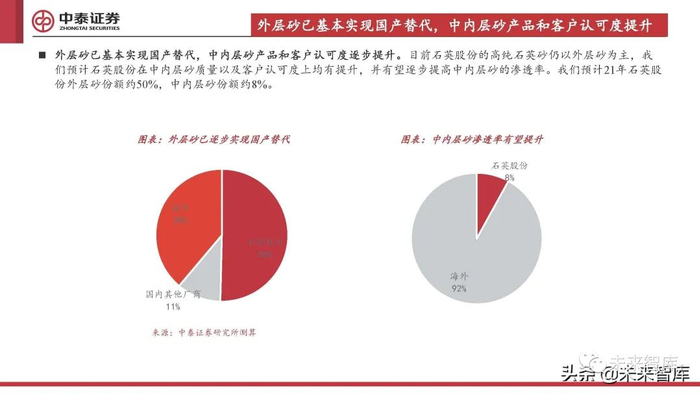 外层砂已基本实现国产替代,中内层砂产品和客户认可度逐步提升。目前石英股份的高纯石英砂仍以外层砂为主,我 们预计石英股份在中内层砂质量以及客户认可度上均有提升,并有望逐步提高中内层砂的渗透率。我们预计21年石英股 份外层砂份额约50%,中内层砂份额约8%。