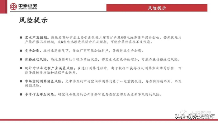 N型硅片占比提升:N型单晶电池效率更高,预计2030年占比有望提升至50%。而N型硅片对于多晶硅原料以及部分辅材 的纯度要求更高,N 型硅片更换石英坩埚频率更高,进而对高纯石英砂的需求量更高。因此,除了光伏下游总量的提升, 结构升级望贡献高纯石英砂行业增量。