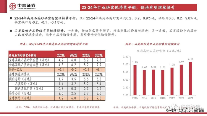 22-24年高纯石英砂供需有望保持紧平衡。预计22-24年高纯石英砂需求约6.2、8.2、9.9万吨,供给约6.0、8.2、9.8万吨, 供需缺口为-0.2、-0.1、-0.1万吨。