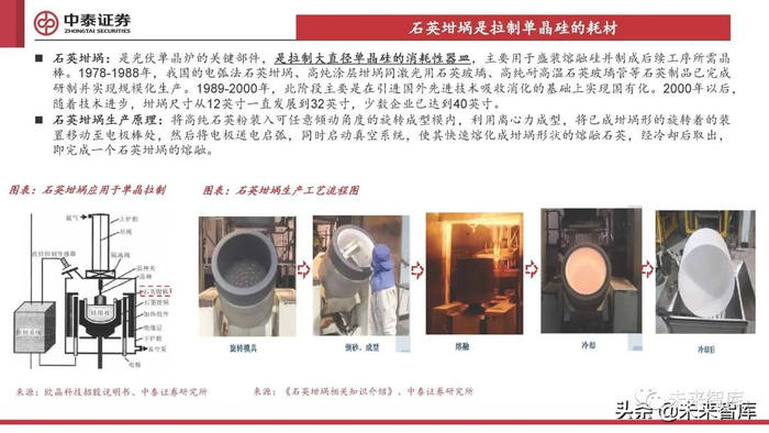 石英坩埚:是光伏单晶炉的关键部件,是拉制大直径单晶硅的消耗性器皿,主要用于盛装熔融硅并制成后续工序所需晶 棒。1978-1988年,我国的电弧法石英坩埚、高纯涂层坩埚同激光用石英玻璃、高纯耐高温石英玻璃管等石英制品已完成 研制并实现规模化生产。1989-2000年,此阶段主要是在引进国外先进技术吸收消化的基础上实现国有化。2000年以后, 随着技术进步,坩埚尺寸从12英寸一直发展到32英寸,少数企业已达到40英寸。