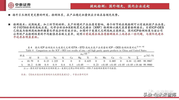 检测技术:试剂纯度、加工环节的材料、生产环境对产品品质有影响,每个环节的在线检测可以有效把控产品品质。对于IOTA标准的高纯石英,化学分析法和X射线荧光光谱法(XRF)检测难以满足其质量检测要求。目前ICP-OES 已经成为检测高纯物料微量化学成分的有效方法。