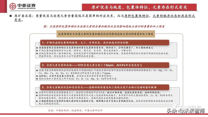原矿要求高:质量优劣与杂质元素含量高低不是简单的对应关系,而与原料包裹体特征、元素的赋存状态和存在形式 有关。