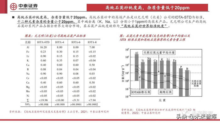 高纯石英砂纯度高,杂质含量低于20ppm。高纯石英砂中的高端产品是以尤尼明(北美)公司的IOTA-STD为标准, 十二种元素杂质的含量小于20ppm,其中碱金属(K,Na,Li)分别小于1ppm的高技术产品。尤尼明公司生产的高纯 石英砂系列产品占据全世界大部分市场,其石英产品纯度被称为“高纯石英砂世界标准纯度”。
