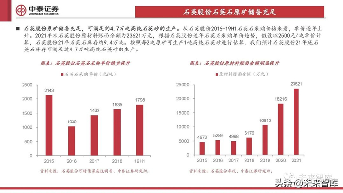 石英股份原矿储备充足,可满足约4.7万吨高纯石英砂的生产。从石英股份2016-19H1石英石采购价格来看,单价逐年上 升。2021年末石英股份原材料账面余额为23621万元,根据石英股份近年石英石采购单价趋势,假设以2500元/吨单价计 算,石英股份21年石英石库存约9.4万吨。按照每2吨原矿可生产1吨高纯石英砂进行估算,我们预计石英股份21年底石 英石库存可满足近4.7万吨高纯石英砂的生产。