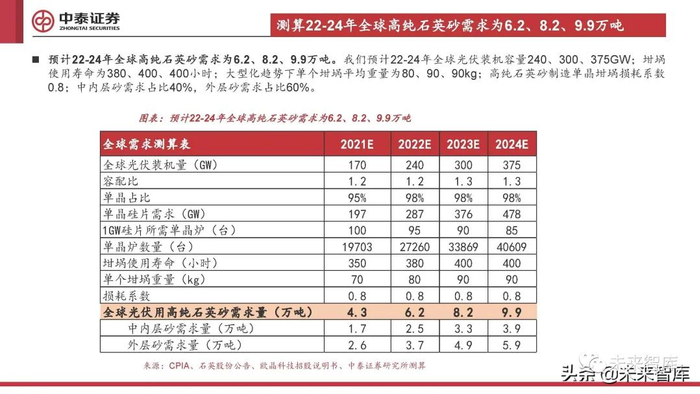 测算22-24年全球高纯石英砂需求为6.2、8.2、9.9万吨