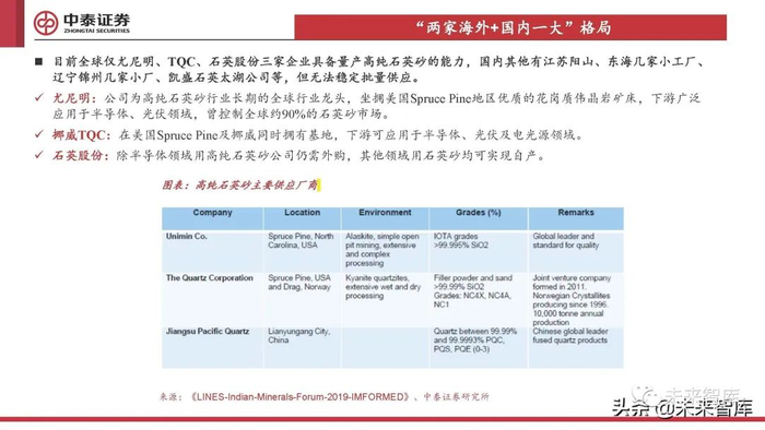 目前全球仅尤尼明、TQC、石英股份三家企业具备量产高纯石英砂的能力,国内其他有江苏阳山、东海几家小工厂、 辽宁锦州几家小厂、凯盛石英太湖公司等,但无法稳定批量供应。