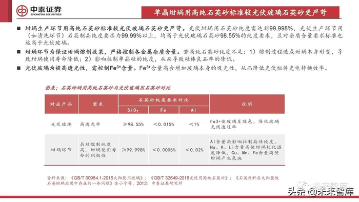 坩埚生产环节用高纯石英砂标准较光伏玻璃石英砂更严苛。光伏坩埚用石英砂纯度需达到99.998%,光伏生产环节用 (如清洗环节)石英制品纯度要求为99.99%以上,均高于光伏玻璃石英砂98.55%的纯度要求,且对杂质含量要求标准也 远高于光伏玻璃。