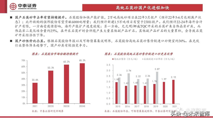 国产石英砂市占率有望持续提升。石英股份加快产能扩张,2万吨高纯砂项目在22年3月投产(预计22年5-6月达到满产状 态);此外收购的强邦股份有望贡献6000吨增量;我们预计新建1.5万吨项目有望于23H1投产。我们预计22-24年海外合计 扩产有限,一方面受疫情影响,海外产能扩产进度放缓;另一方面,尤尼明/挪威TQC开采的石英矿来自伟晶岩矿床,而 伟晶岩二氧化硅含量约25%,在开采石英矿时会伴随产生大量其他副产品矿石。其他副产品矿石的大量累积,会导致石英 矿开采经济性下降。