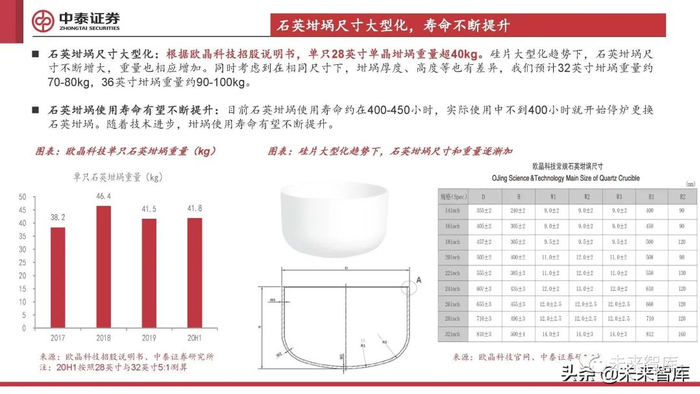 石英坩埚尺寸大型化:根据欧晶科技招股说明书,单只28英寸单晶坩埚重量超40kg。硅片大型化趋势下,石英坩埚尺 寸不断增大,重量也相应增加。同时考虑到在相同尺寸下,坩埚厚度、高度等也有差异,我们预计32英寸坩埚重量约 70-80kg,36英寸坩埚重量约90-100kg。