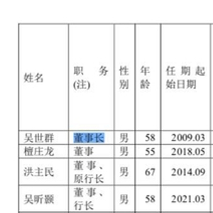 厦门银行2021年年报显示,吴世群现年58岁,历任厦门国际信托投资公司租赁部业务员、租赁部总经理、海沧办事处主任、副总经理兼计划部经理、董事、党委委员,厦门市担保投资有限公司董事、总经理、 公司副董事长兼行长、党组副书记(主持工作)。