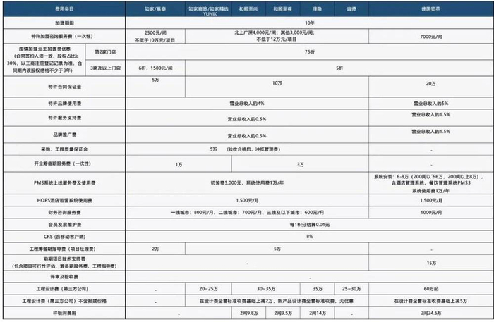 以他咨询过的首旅如家集团公开加盟费用为例,经济型可选择品牌包括如家、莫泰等,中端酒店包括如家商旅、如家精选、YUNIK等,更高水准一些的中高端品牌则包括和颐至尚、建国铂萃、璞隐以及扉缦等。