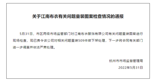 5月31日晚间,杭州市市场监管局发布通报称,5月31日,市区两级市场监管部门对江南布衣服饰有限公司有关问题童装图案进行现场检查,现已责令该公司对相关问题童装509件做下架处理,下一步将会同有关部门进一步调查并依法严肃处理。