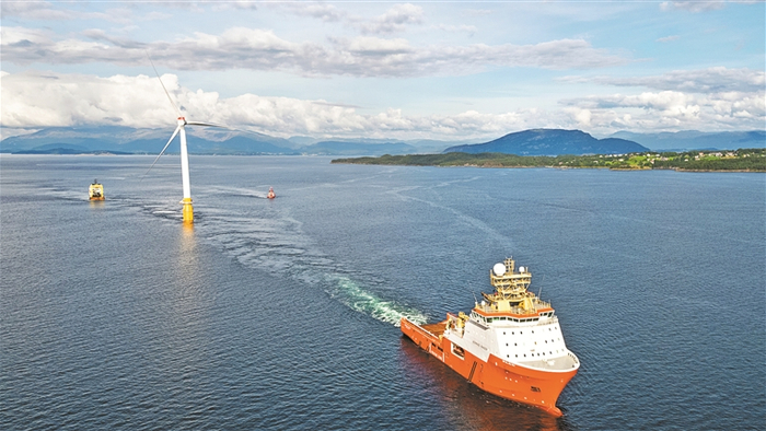 2017年10月,挪威国家石油公司位于英国苏格兰东北海岸的全球首座漂浮式海上风电场正式投产运营。图为拖船拖动风力发电机驶往远海风电场安装。 视觉中国
