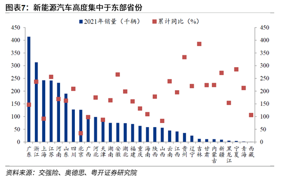 新能源汽车销量高度集中于东部沿海省份,主力仍在限购的特大城市,但近两年销量增速和占比趋势性下滑,而非限购的大中型城市、县乡市场的占比逐步提升。根据交强险数据,2021年广东、浙江、上海、江苏新能源乘用车销量居前,占全市场新能源汽车销量的比重分别为14.2%、10.8%、8.4%和8.3%。东部沿海省份销量领先的原因有三:一是经济较发达,需求本身较旺盛;二是人口结构较好,青壮年占比高,对于新能源车的接受度更高;三是没有寒冷气候导致电池续航缩水的困扰。近两年限购城市需求趋稳,销量占比有所下滑,而非限购城市新能源汽车销量增长较快。例如2021年成都、苏州、佛山等城市,新能源乘用车同比增速分别为181.9%、236.4%和341.4%。