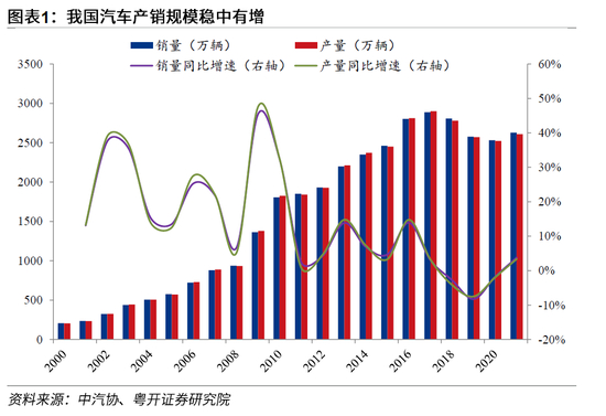 1、从整体看,中国是全球最大的汽车市场,产销规模位列第一,近年来虽有波动,但保持了稳中有增的发展态势。2021年汽车产销分别完成2608.2万辆和2627.5万辆,同比增长3.4%和3.8%,结束了三年的平台调整期,增速企稳回升。2022年疫情再度对汽车市场产生较大冲击,政策护航下汽车行业已进入周期复苏。