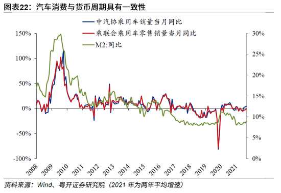 第二,货币政策也对汽车消费产生积极影响。例如2009年、2015年均处于经济下行压力较大时期,央行多次下调贷款基准利率,宽松的流动性环境对汽车消费有一定促进作用。数据上,汽车销量与M2同比增速较一致。