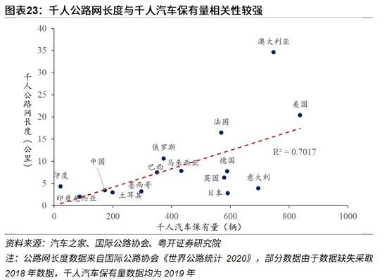 长期看,城市道路交通的不断优化,公路网络的深入蔓延,充电桩、换电站等设施的完善,停车位等配套设施的丰富将改善汽车使用环境,对汽车消费形成正向促进。国际经验显示,公路里程和汽车保有量基本呈正比,但近年来交通拥堵、配套设施不完善等问题一定程度上制约了汽车消费。