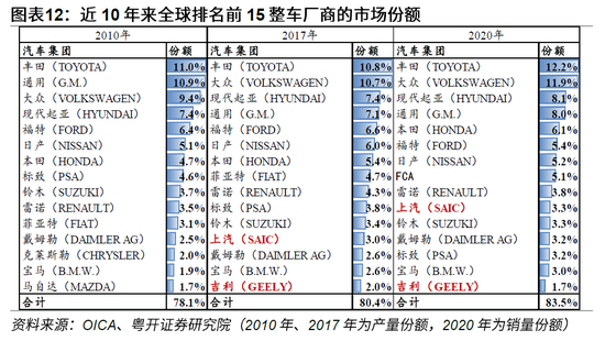 4、过去十年世界汽车产业竞争格局较固化,自主品牌难与老牌车企比肩,但随着全球减碳的深化,叠加汽车产业电动化、智能化的发展趋势,产业格局面临重塑,部分自主品牌有望实现变道超车。