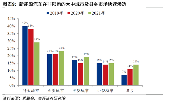 区域上,限购的特大城市依然是新能源汽车消费的主力,但近两年需求趋稳,销量增速和占比有所下滑,而未实施限购的大中型城市、县乡市场的销量占比逐步提升。2021年成都、苏州、佛山等城市,新能源乘用车同比增速分别为181.9%、236.4%和341.4%。新能源汽车在非限购地区的快速渗透,反映出新能源汽车产业发展已从政策驱动逐步转向市场驱动。