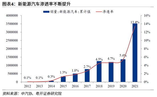 据中汽协数据,2021年传统燃油车累计销量为2275.4万辆,同比减少5%,新能源汽车累计销量352.1万辆,同比上涨157.5%。2020年以来,新能源汽车销售增速显著高于传统燃油车,渗透率不断提升,2021年12月新能源汽车渗透率达到19.1%,乘用车渗透率更是超过20%,全年渗透率13.4%,增长8个百分点。