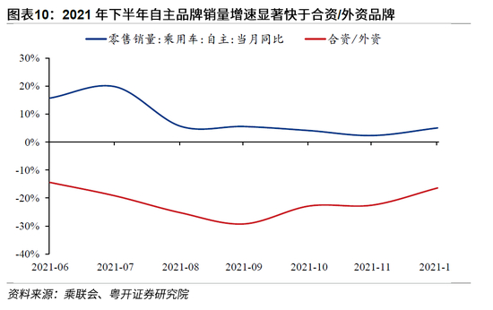 3、国潮当红,合资式微,自主品牌强势崛起,造车新势力呈“千帆竞发”的多元发展格局。根据乘联会数据,2021年自主品牌累计销售829.8万辆,同比增长20.6%,市场占有率为41.2%,较上年提升5.5个百分点;而合资及外资品牌累计销售1184.8万辆,同比减少4.5%。尤其是2021年下半年以来,自主品牌的销量增速显著高于合资/外资品牌。