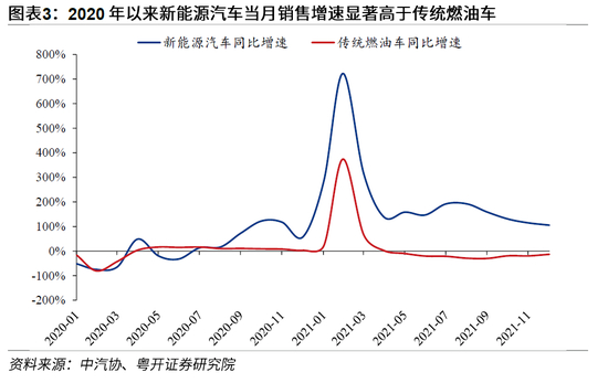2、从汽车耗能结构看,新旧能源分化显著,绝对量上燃油车仍是消费主力,但新增乏力;新能源汽车发展迅猛,“油换电”不断提速。据中汽协数据,2021年传统燃油车销量为2275.4万辆,同比减少5%;新能源汽车累计销量352.1万辆,同比增长157.5%。新能源汽车全年渗透率13.4%,增长8个百分点,12月数据更是超过20%。